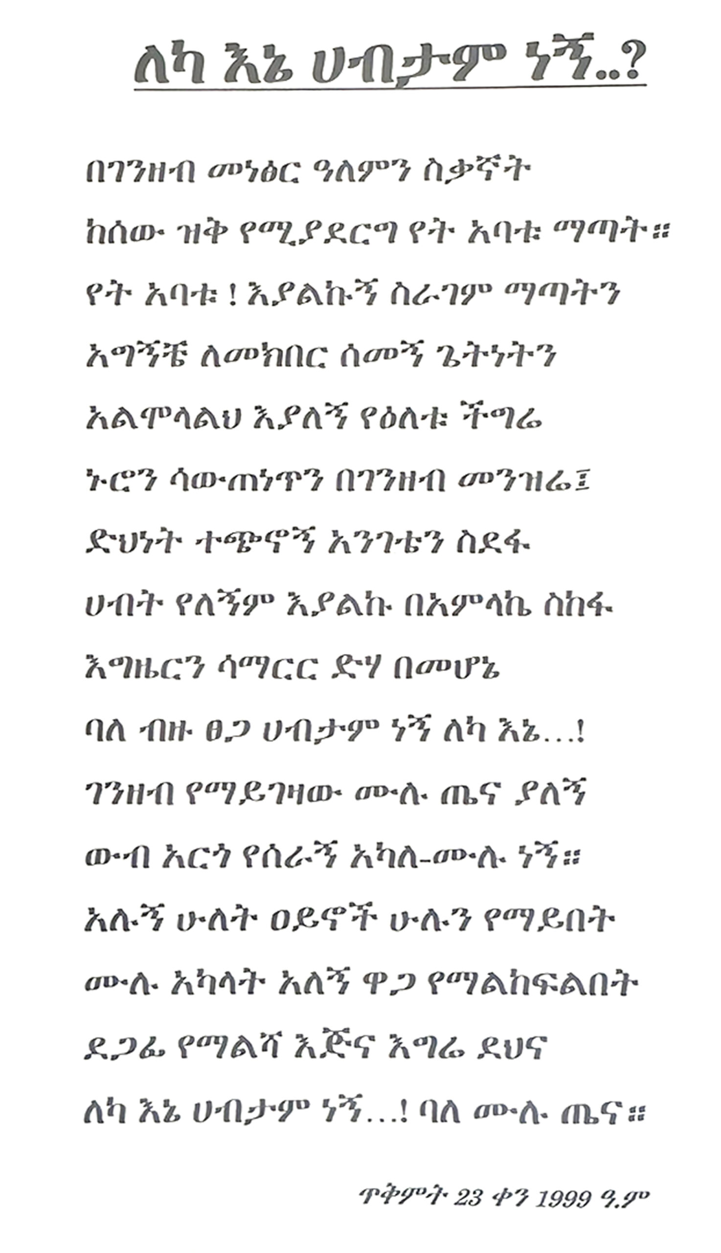 The book views the cycle of nature, life, the human condition and ultimate matters. It is a wisdom poem, inspires the heritage of Ethiopian culture and toast life’s milestone.